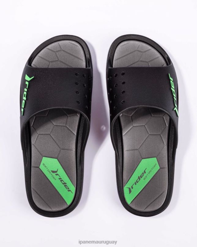 ¡El tobogán Rider Bay ocupa un lugar digno en cada escena del calzado de verano! Esta sandalia liviana está diseñada para ser fácil de usar: puedes ponértelas y pasear sin ninguna preocupación en el mundo. una plantilla texturizada solo aumenta el placer de tu paso de verano. visto aquí en gris negro.